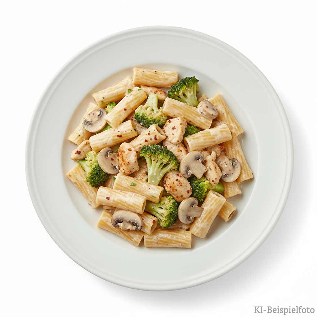 Rigatoni (WEIZENMEHL, Wasser), Tomatensoße (Tomaten, Zwiebel, Gewürze), Erbsen (Erbsen, Wasser)